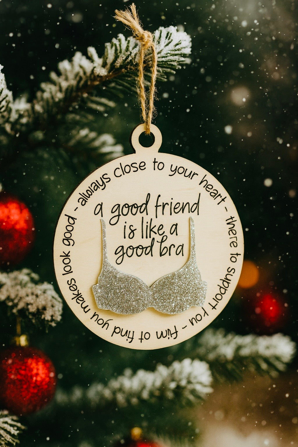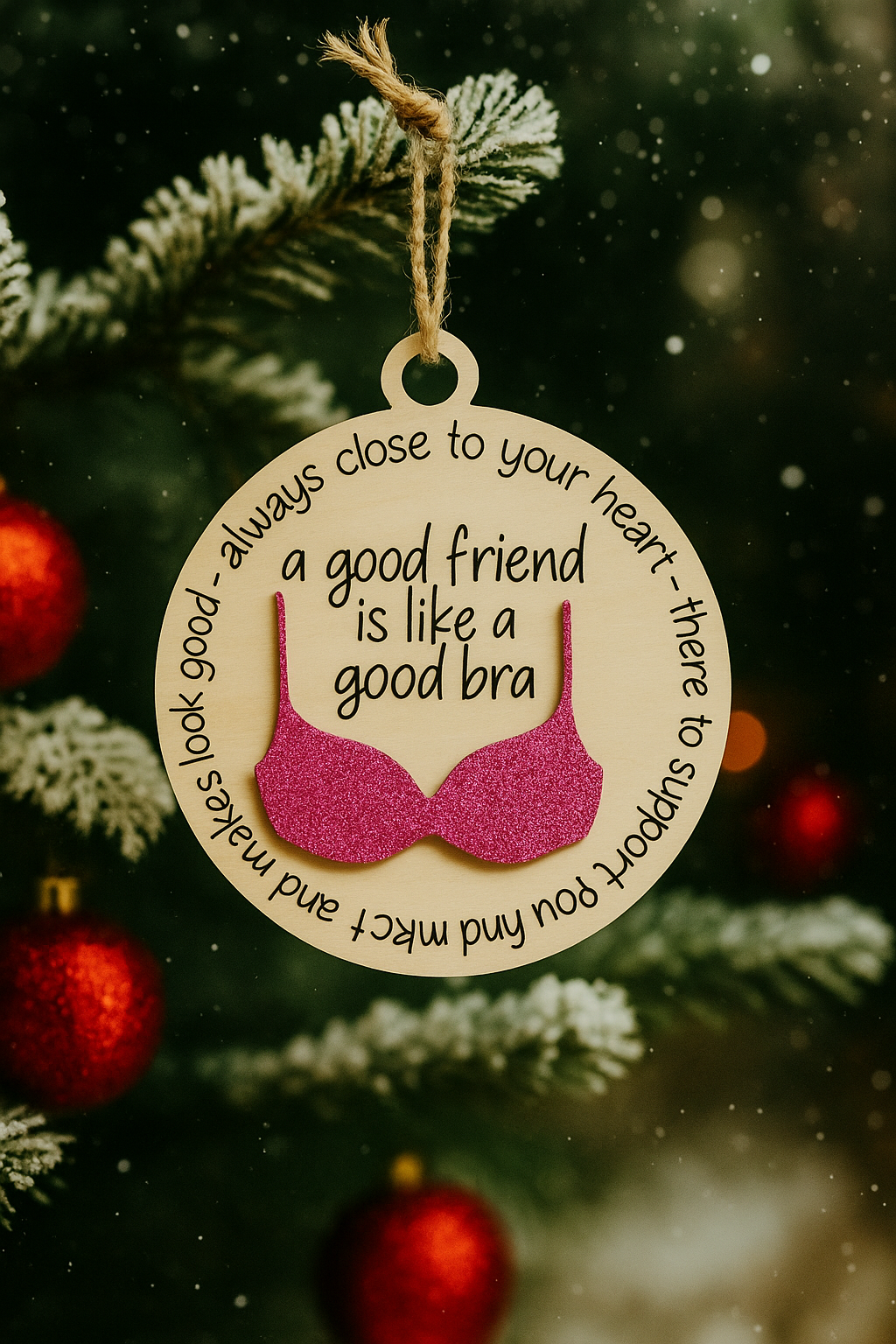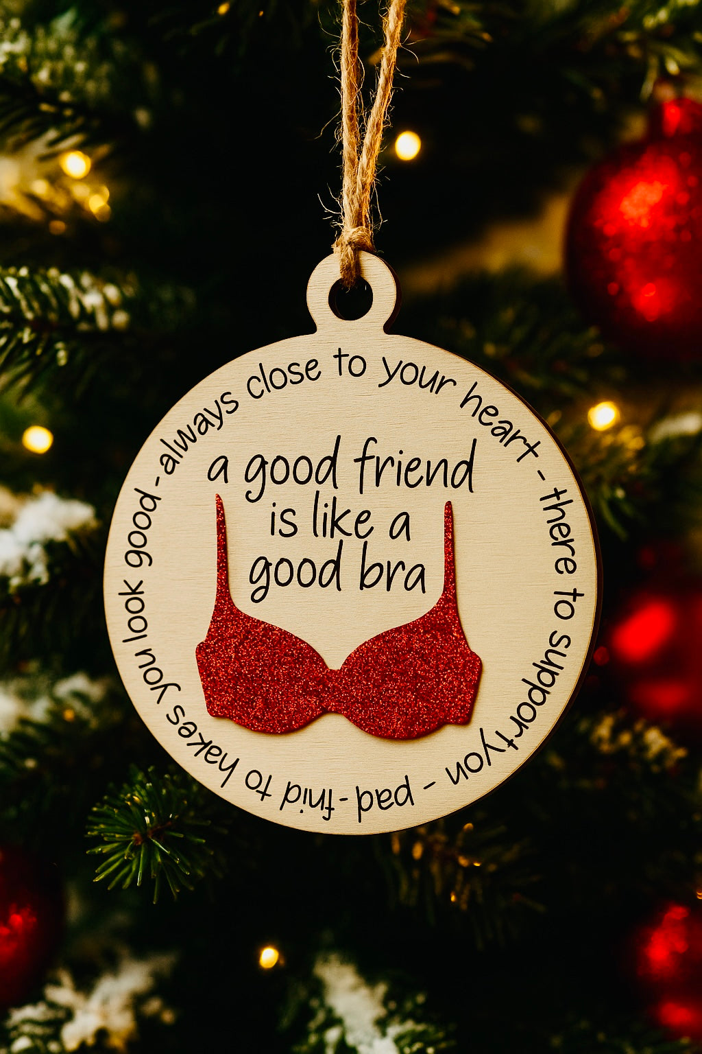Add a touch of humor and sparkle to your holiday décor with this friendship-inspired Christmas ornament. Crafted from high-quality maple wood and accented with a glittery bra design, this ornament makes the perfect gift for your best friend, sister, or anyone who loves a good laugh.