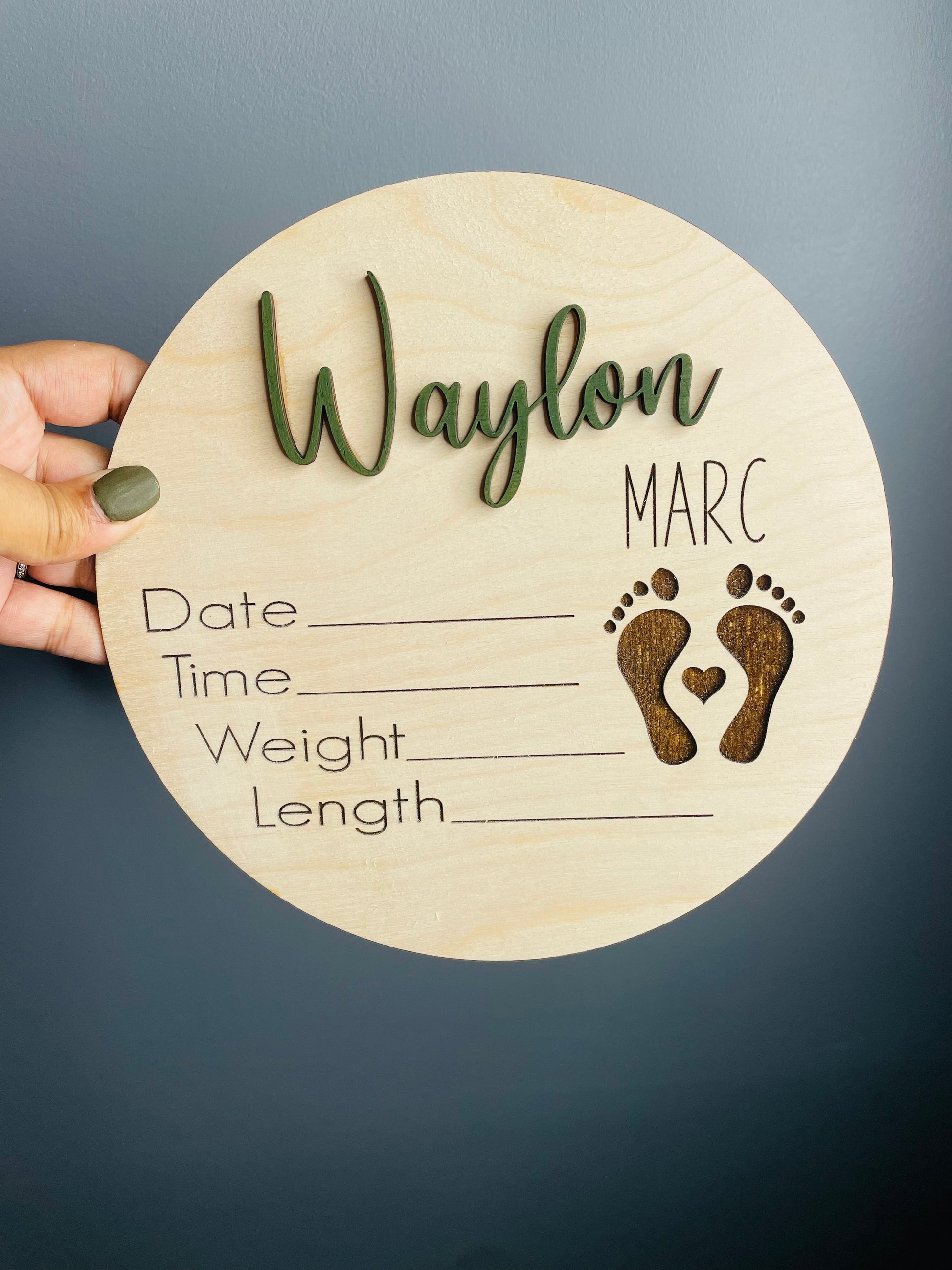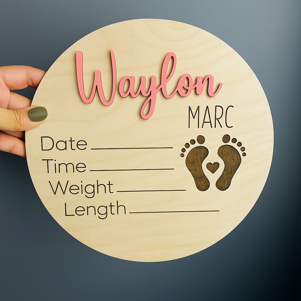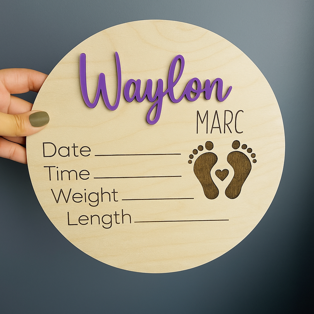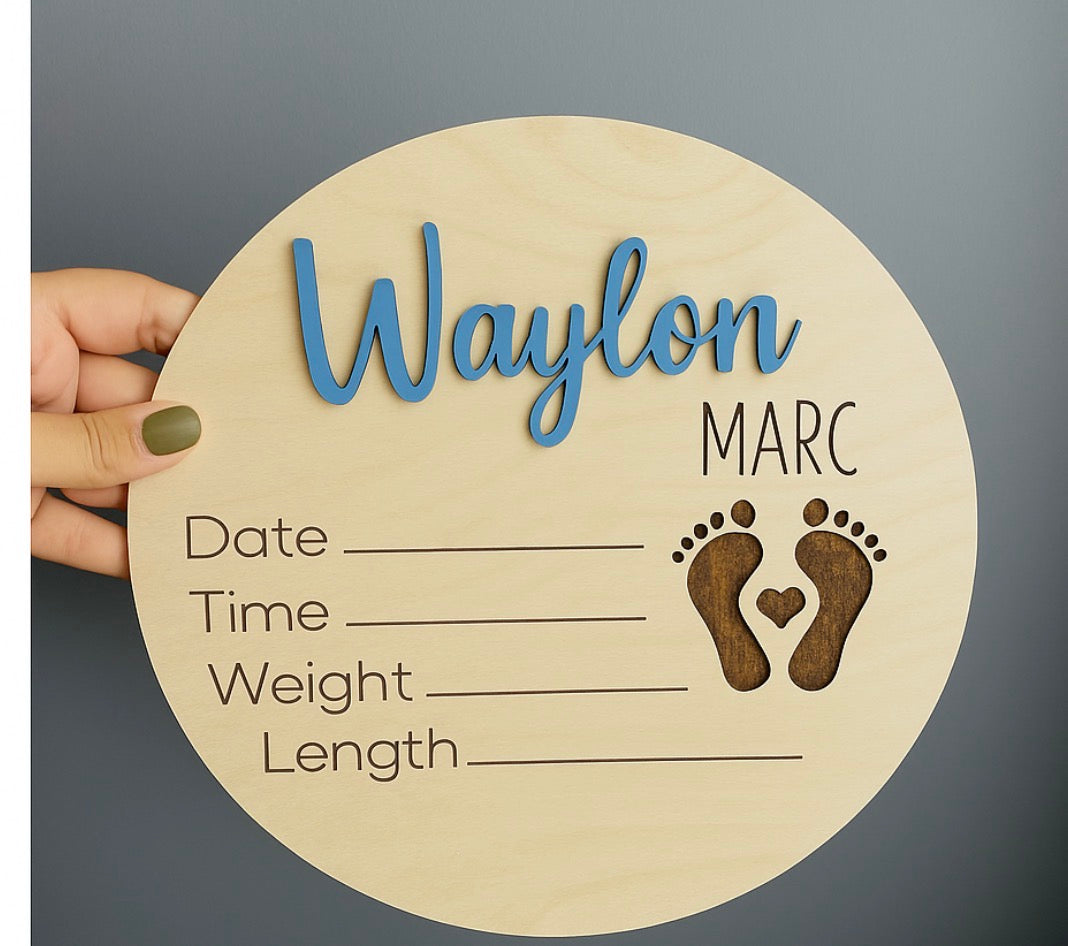 Celebrate the arrival of your little one with this beautifully crafted wooden birth announcement disc. Featuring a layered 3D name in your choice of blue, green, yellow, purple, or pink, this round plaque is both stylish and meaningful. The engraved details include spaces for the baby’s date, time, weight, and length, along with an adorable pair of engraved baby footprints accented with a heart.