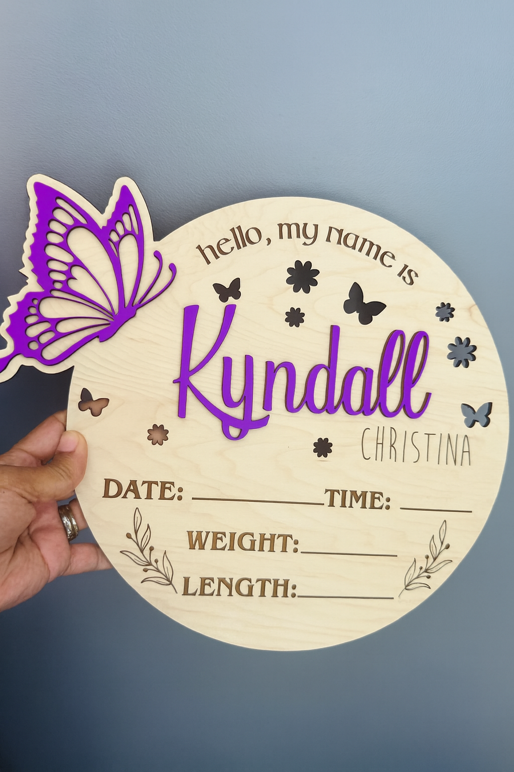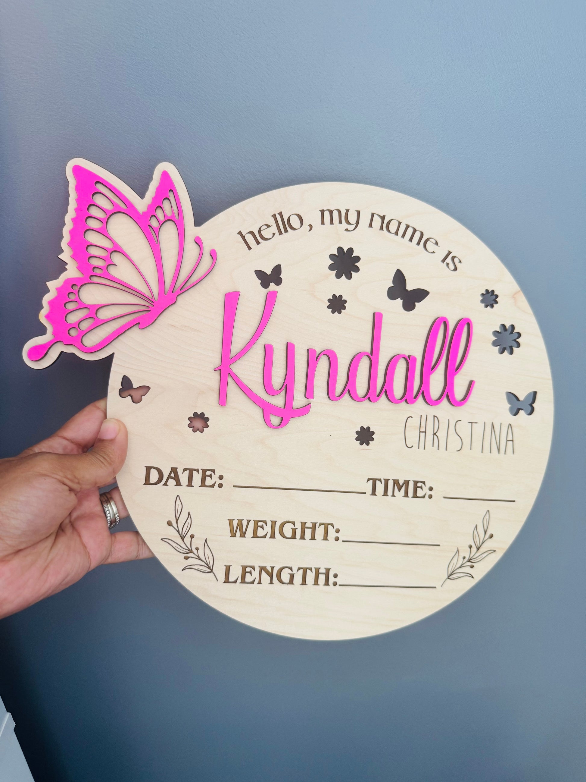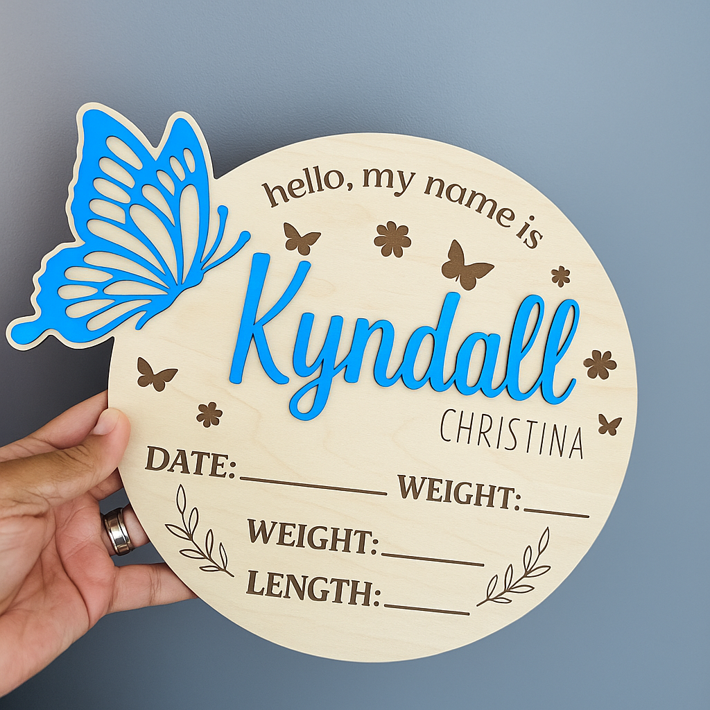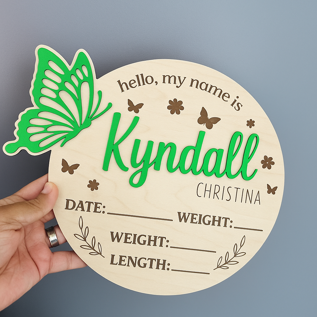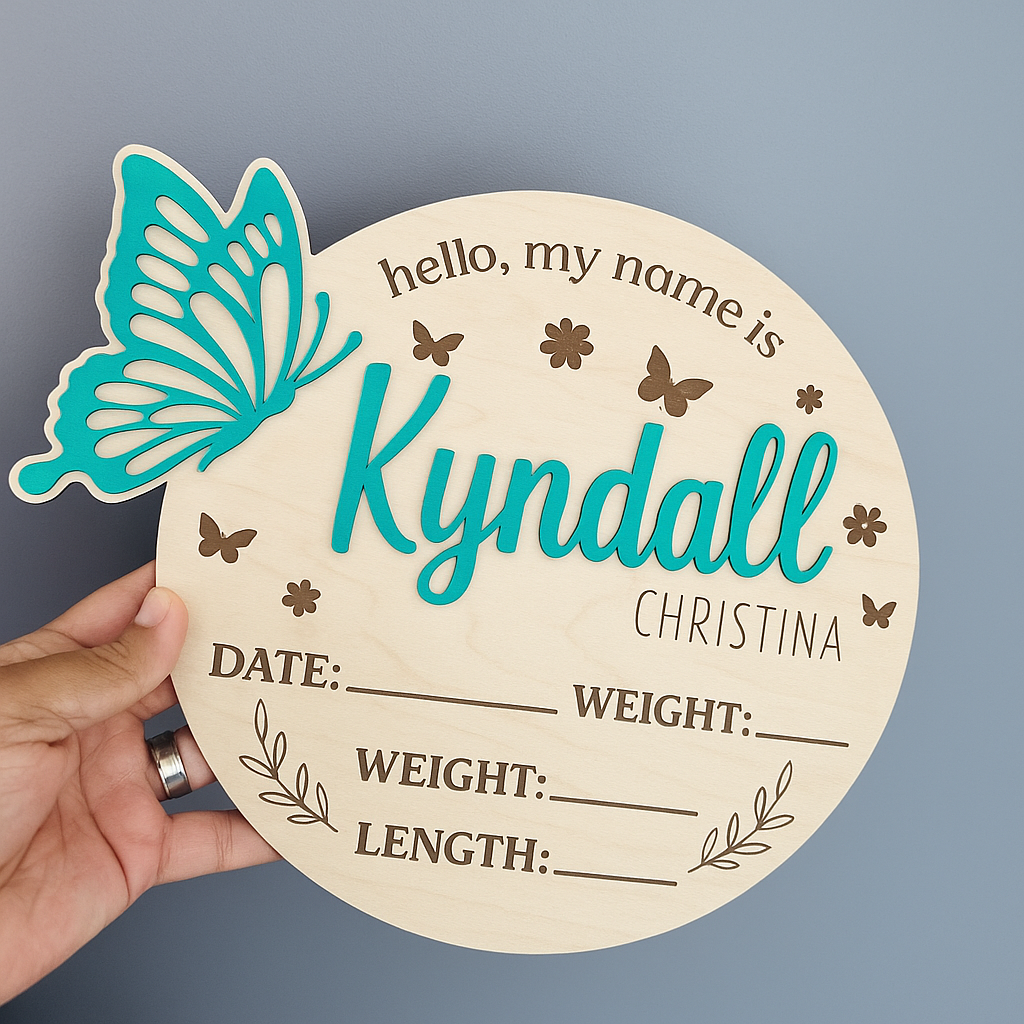 The design includes engraved details with spaces to record your baby’s date, time, weight, and length, surrounded by whimsical butterflies and floral accents. It’s an ideal photo prop for newborn photography, hospital introductions, or a treasured keepsake to display in your nursery.